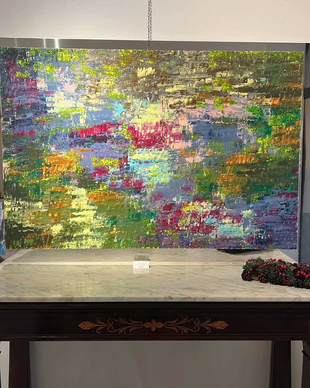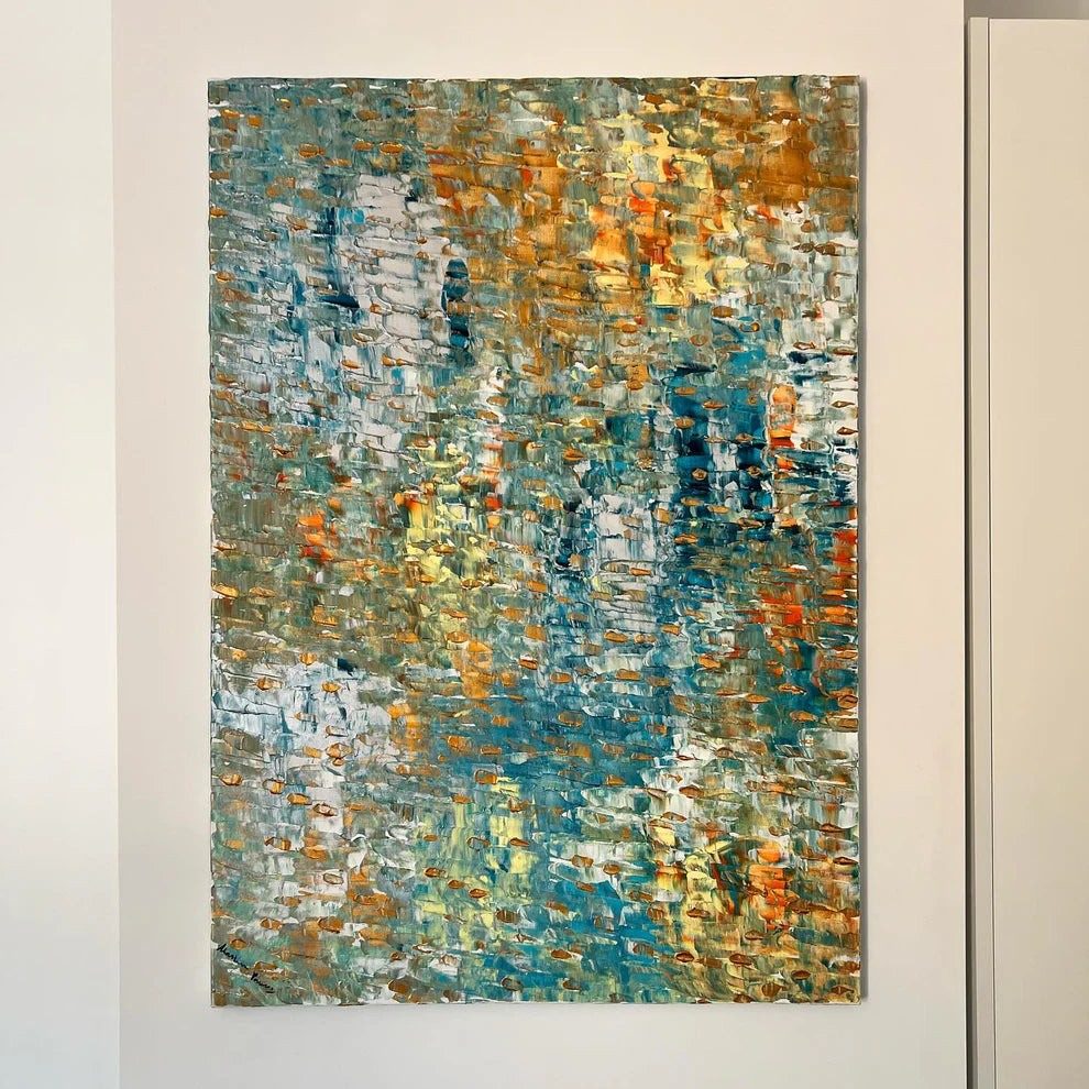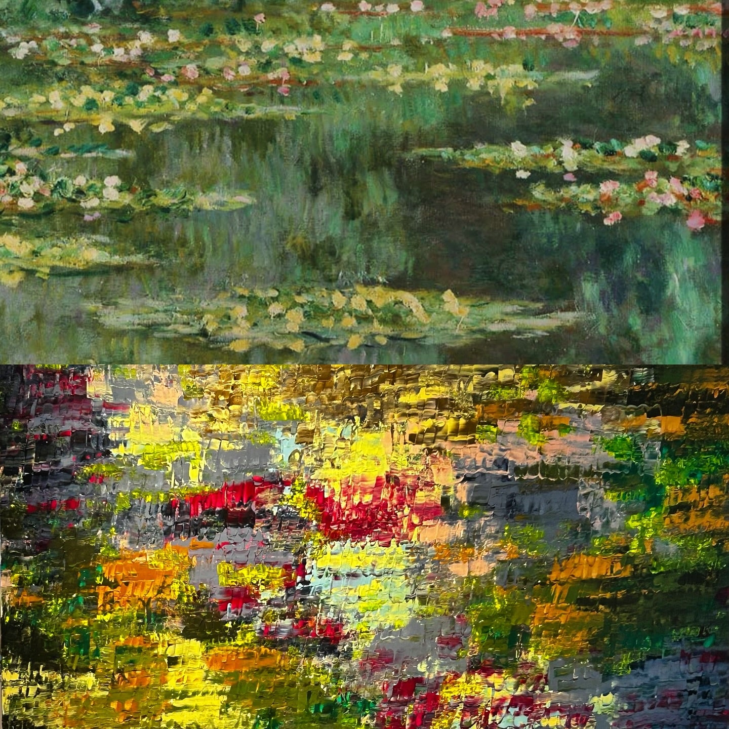 "Il confronto che potrebbe sembrare azzardato tra le “Ninfee” di Monet e l’opera contemporanea di Martina Panno rivela punti in comune nonostante l’apparente distanza stilistica. Entrambe le opere esplorano l’interazione tra luce, colore e riflessi, seppur con approcci differenti. Monet si muove verso l’impressione immediata del paesaggio, mentre l’opera contemporanea trasforma questo studio in un’esperienza puramente cromatica e gestuale. Monet utilizza il colore in modo delicato, con sfumature che si fondono per creare un’atmosfera eterea e naturale. La sua attenzione è rivolta alla luce e ai suoi riflessi sull’acqua. L’opera contemporanea mostra invece una scomposizione cromatica più netta e decisa, con pennellate materiche e colori accesi, ma conserva il tema della rifrazione della luce.