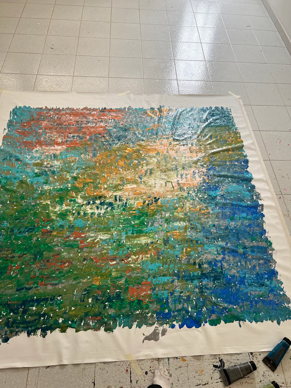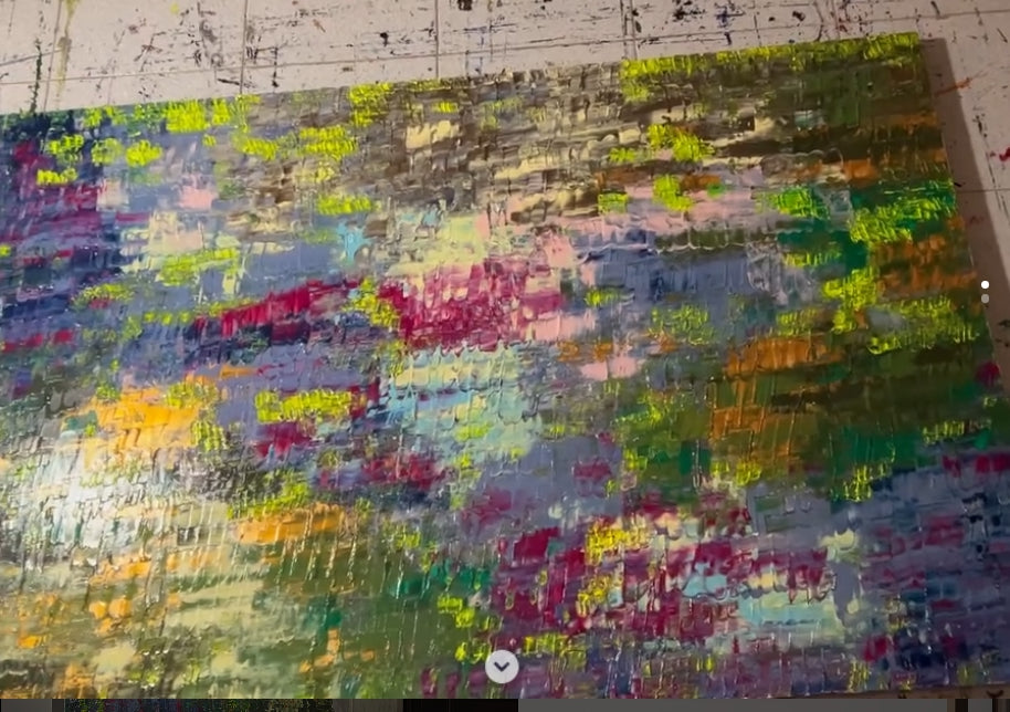 "L'opera è un'esplosione cromatica di straordinaria intensità e complessità. Questa creazione, caratterizzata da una vibrante tavolozza di colori e da una tecnica pittorica ricca di dinamismo, invita l'osservatore a un viaggio emozionale attraverso un paesaggio astratto, carico di energia e movimento. La composizione, priva di un punto focale definito, si sviluppa attraverso una serie di stratificazioni cromatiche che sembrano pulsare e vibrare sulla superficie della tela. I colori, applicati con pennellate dense e decise, creano un tessuto visivo che si avvicina al gesto pittorico dell'Action Painting, dove ogni traccia di colore diventa un'espressione spontanea e gestuale dell'artista.