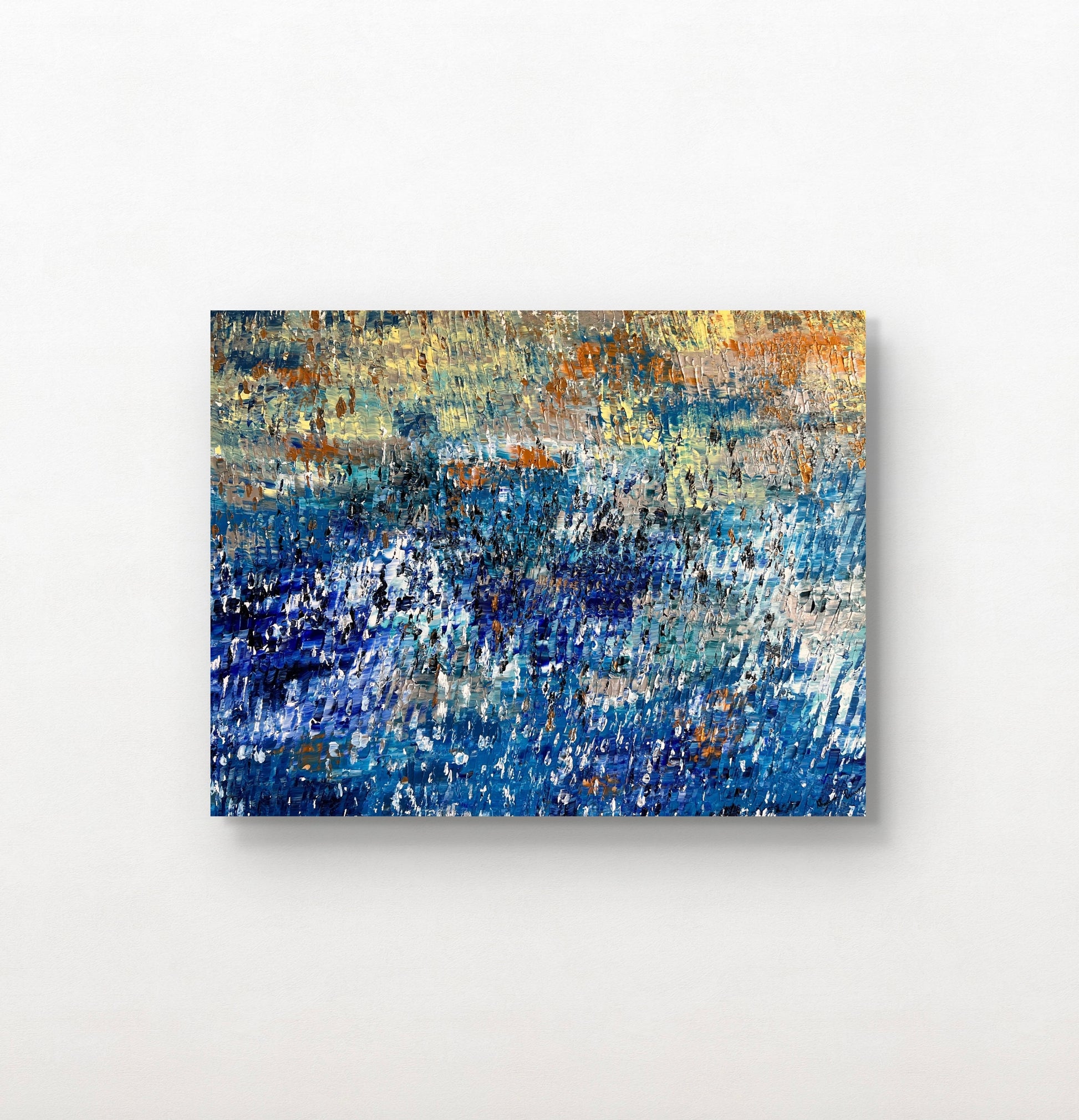 Il mare, rappresentato da tonalità di celeste, argento e blu, appare calmo e rassicurante, mentre nella parte superiore si apre il cielo. Non è importante definire se si tratti di un’alba o di un tramonto: il cielo, con i suoi toni gialli e celesti, è attraversato dai raggi del sole, resi con sfumature dorate che si diffondono su tutta la composizione.